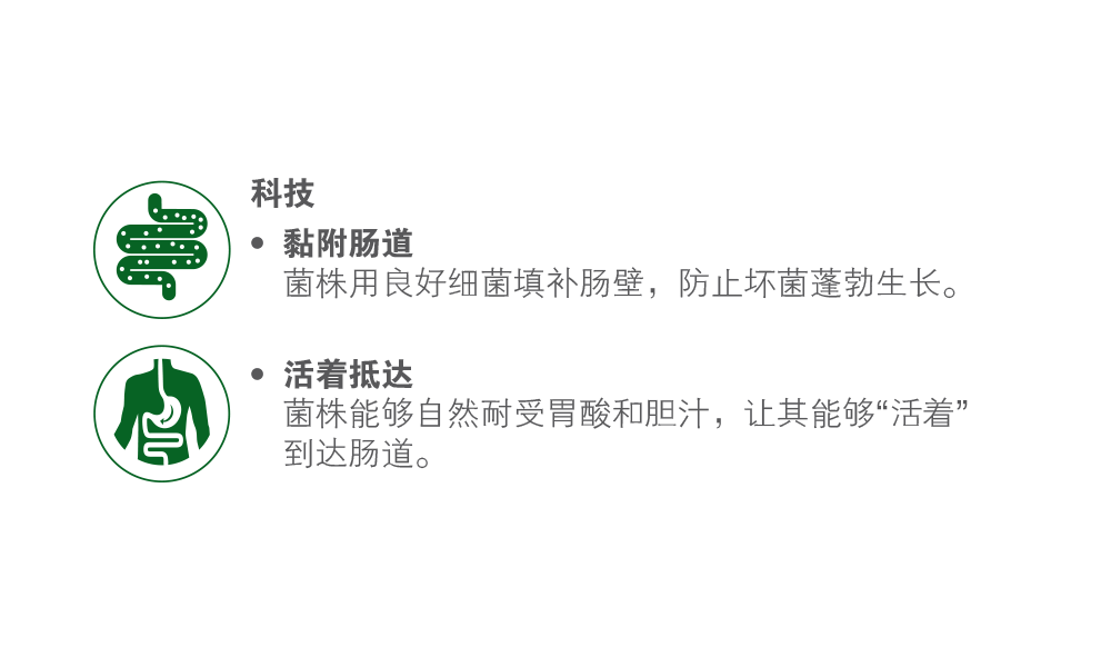 保持活性 - Nutrilite 益生菌菊苣根精华综合植物饮料中的菌株能够自然耐受胃酸和胆汁,“活着”抵达肠道。 黏附肠道 - Nutrilite 益生菌菊苣根精华综合植物饮料中的菌株利用有益菌群填补肠壁,防止有害细菌滋生。