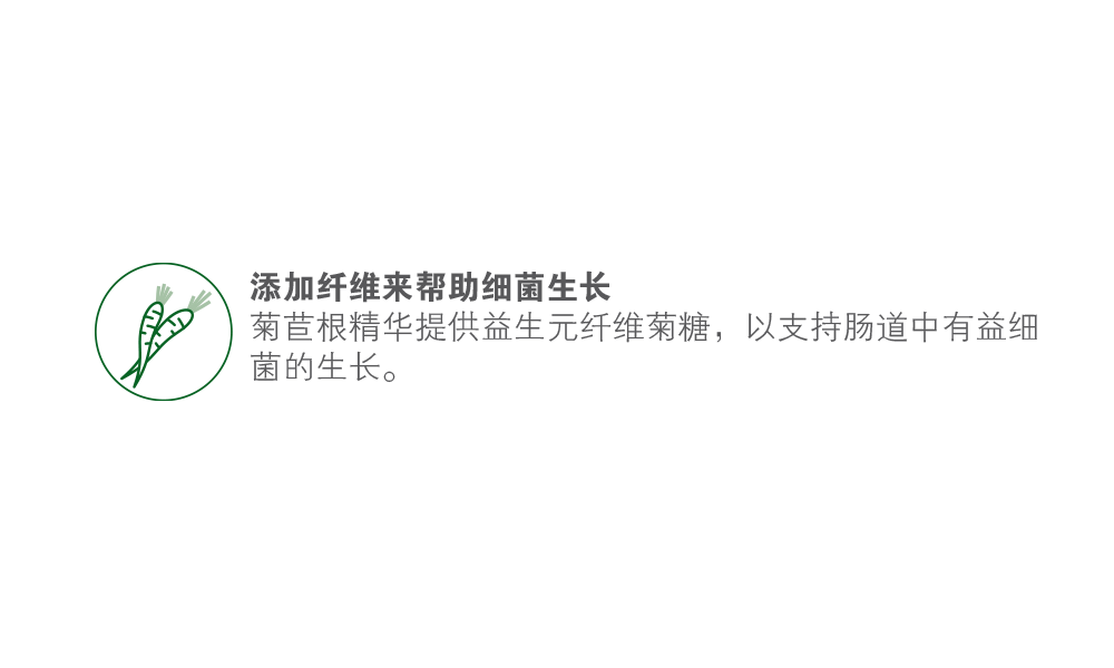 Nutrilite 益生菌菊苣根精华综合植物饮料富含益菌生长所需的额外纤维。菊苣根提取物提供益生元纤维菊糖,支持肠道中有益细菌的生长,进一步促进肠道健康。
