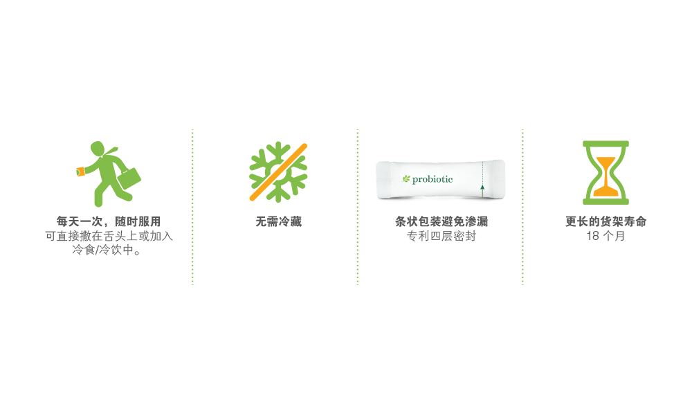 每天享用一条NUTRILITE 益生菌菊苣根精华综合植物饮料,而且可以随取随用。您可以直接将粉剂撒在舌头上,或将其添加至冷食或冷饮中。 本产品采用经过专利认证的4层密封包装,防止粉剂渗漏,保质期为18个月,且无需冷藏。