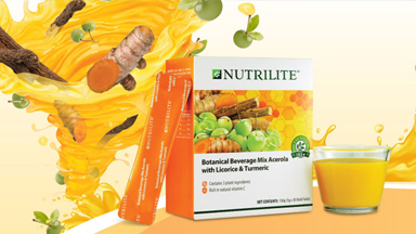 This beverage contains acerola cherries packed with vitamin C (100mg) and herbal ingredients such as licorice (300mg) and turmeric (300mg). Both licorice and turmeric are herbal remedies in Asian cooking and culture. Citrus orange-flavoured and available in convenient stick packs.